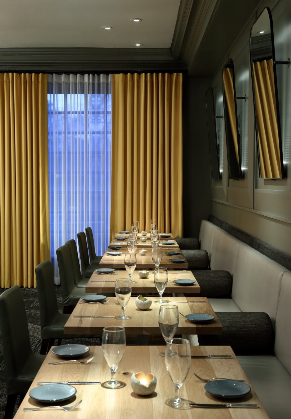 The refresh of Aria resulted in a more approachable interior environment. We opened the bar to the dining room, introduced texture with walnut wall panels and white oak table tops, redesigned the flow of the bar to be more communal and introduced warmer earth tones with splashes of color in the paint and upholsteries.